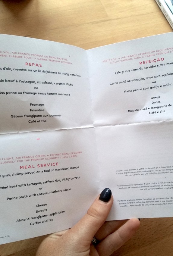 A snap of the menu onboard Premium Economy. Expect French cuisine in smaller portions: Foie Gras, sautéed beef and cheese.